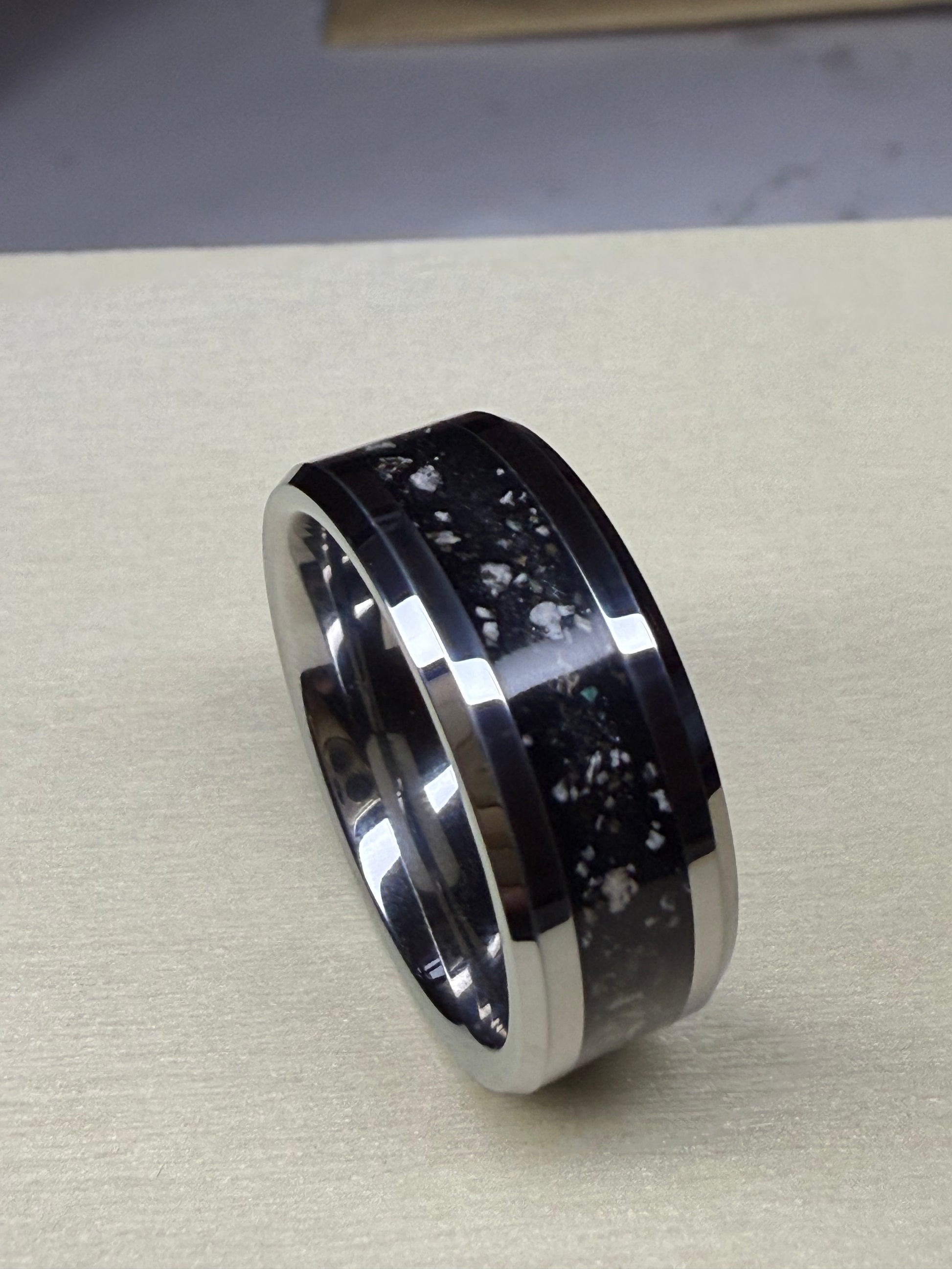 Encapsulate your precious cremations, or hair inside of this simplistic inlay ring. Please note this listing is for a thicker style of 8mm wide ring 😊