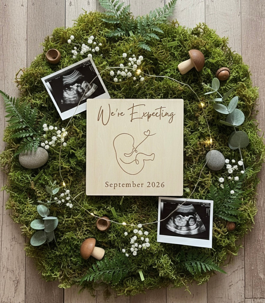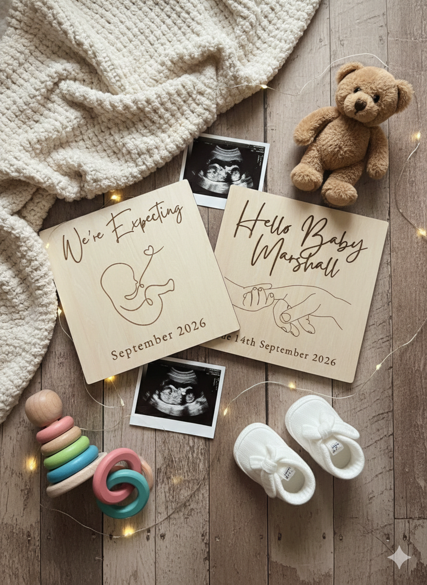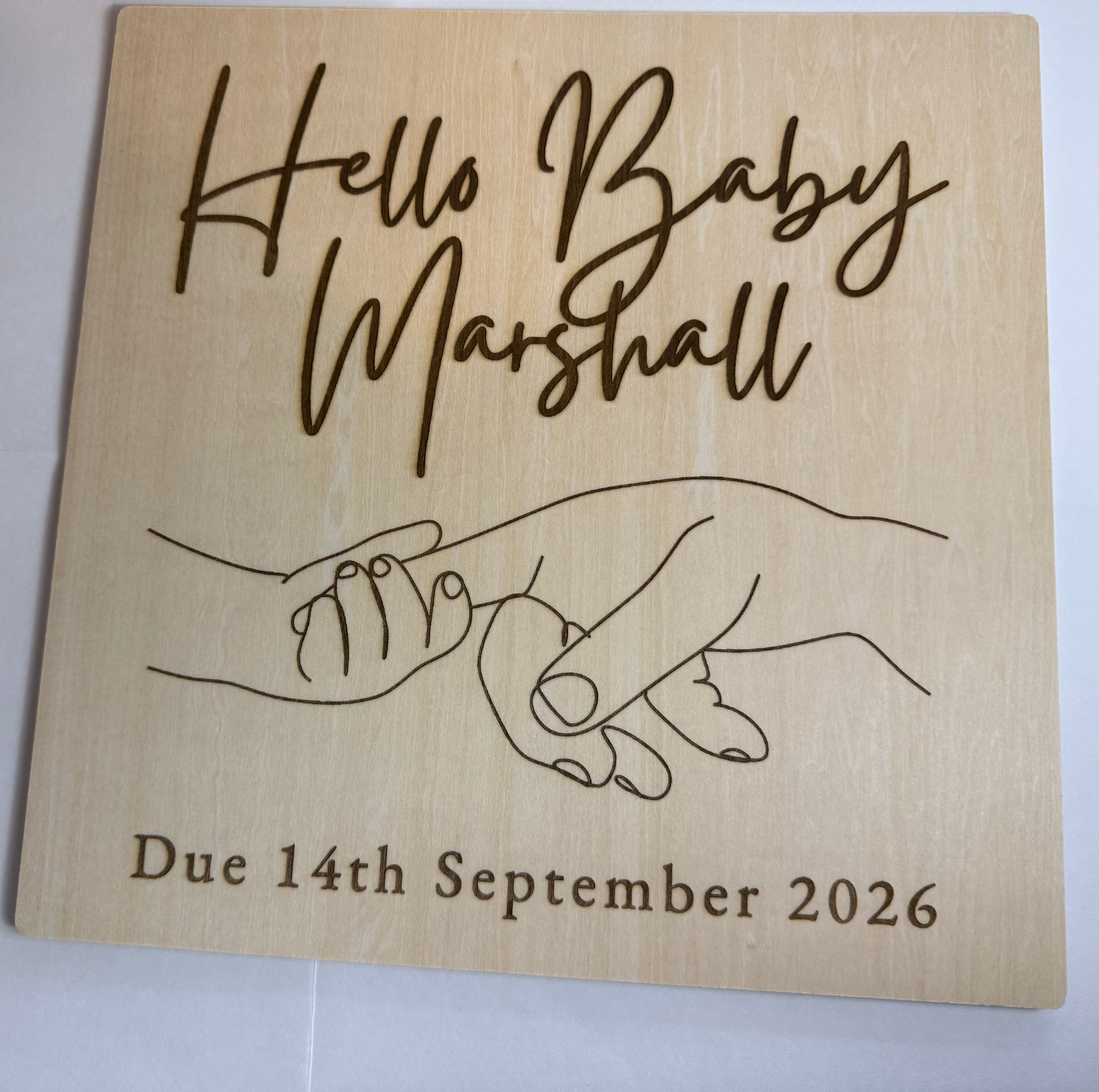 A personalised baby announcement plaque. Feel free to contact us with the date or name you would lThe Personalised Baby Announcement Plaque measures 30x30cm and is crafted from high-quality basswood. It is engraved with a custom name or date, providing a lasting and personalized keepsake. This plaque serves not only as a decorative piece but also as a meaningful memento of your announcement. Perfect for instagram and social media.